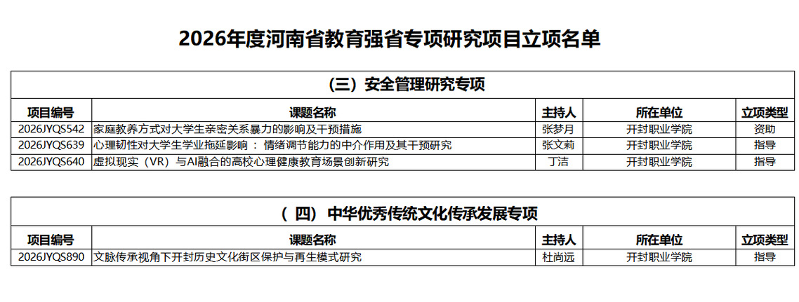 根据《中共河南省委教育工委办公室 河南省教育厅办公室关于开展2026年度河南省教育强省专项研究项目申报工作的通知》(豫教工委办〔2025〕13号)要求,经学校推荐、专家评审并公示无异议后,现将立项名单予以公布,并将有关事宜通知如下: